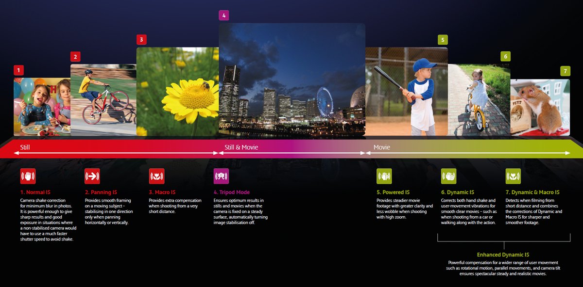 No necesitas una mano firme para crear fotos y vídeos asombrosamente detallados. El Modo de Estabilización de Imagen Inteligente de Canon selecciona automáticamente, de entre 7 modos, la corrección más adecuada para compensar el movimiento. Te permite captar imágenes nítidas rápida y fácilmente, incluso si disparas con el zoom al máximo o en condiciones de luz escasa.