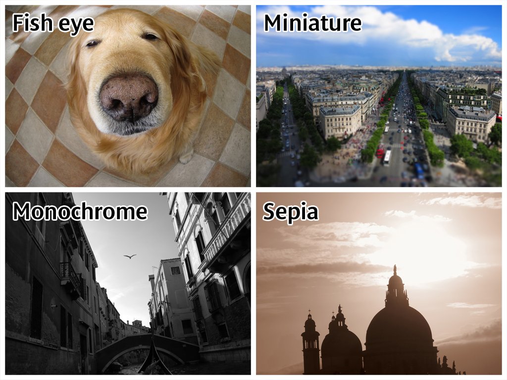 Experimenta y diviértete con una amplia variedad de Filtros Creativos. Entre las opciones se incluye el Efecto Ojo de pez para recrear la distorsión de un objetivo de ojo de pez y Súper Intenso para aumentar la saturación del color. Utiliza el Efecto Miniatura en imágenes o vídeos para crear escenas que parezcan modelos en miniatura.